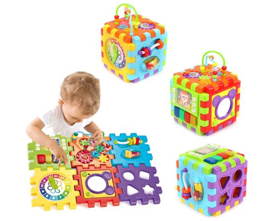 Многофункциональный бизиборд-пазл из шести частей с вариативностью сборки, который надолго увлечет ребенка своим возможностями: