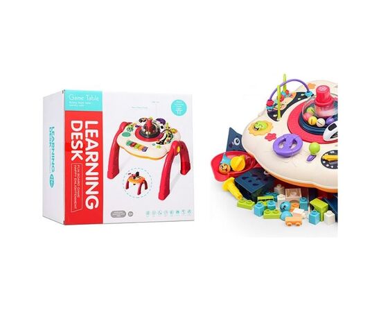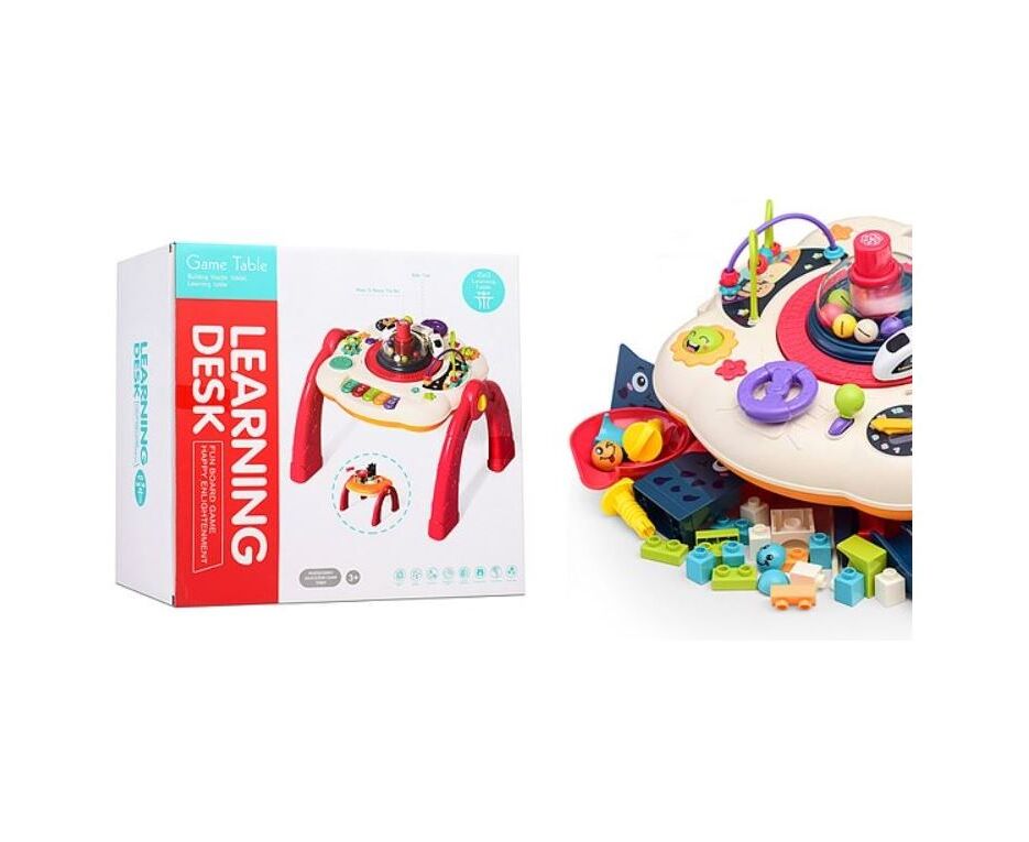 Двухсторонний развивающий столик: одна сторона с различными развивающими играми, другая для строительства из блочного конструктора.