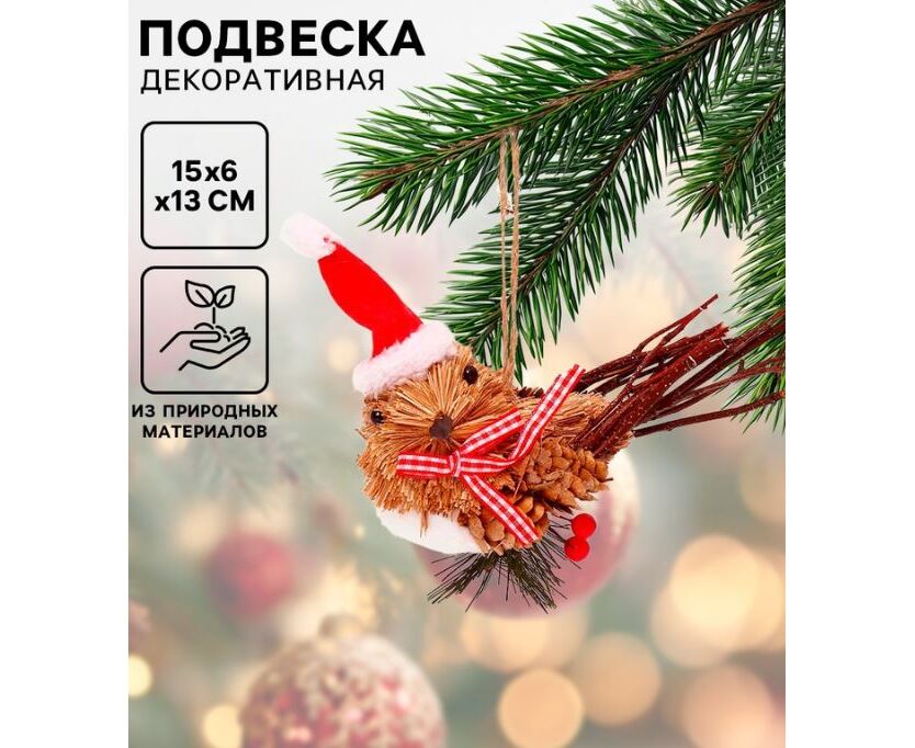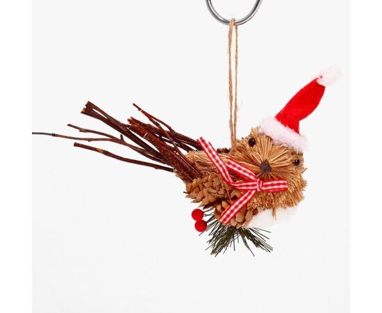 Елочная игрушка соломенная "Птичка в новогоднем колпаке"