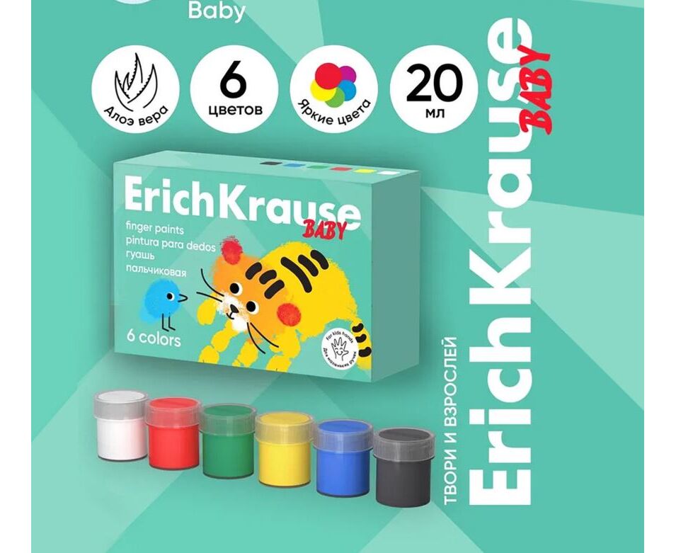 Гуашь пальчиковая, 6 цветов × 20 мл, ErichKrause Baby, с Алоэ Вера