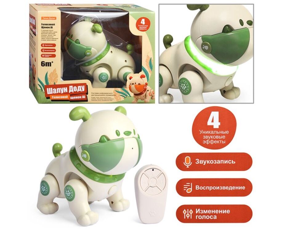С помощью пульта управления робот-щенок выполяет различные команды: