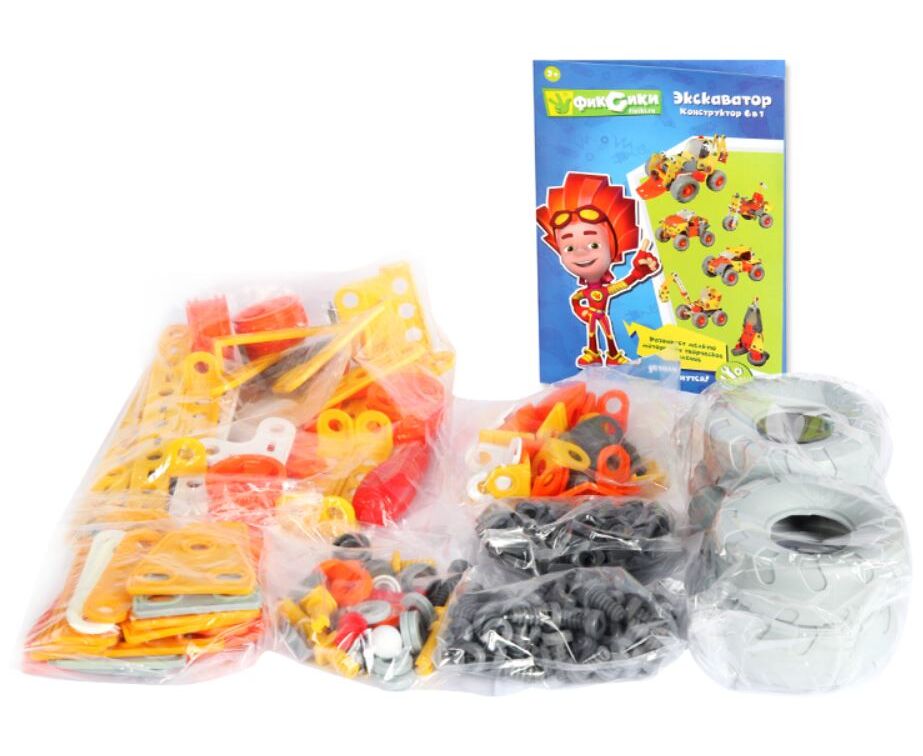Фиксики - это маленькие человечки, которые живут в каждом доме, но вот только люди их никогда не видят. А всё потому, что эти малыши умеют превращаться в винтики, тем самым скрываясь от людского взора. Они обязательно помогут поскорее собраться вашему конструктору! Конструктор 6 в 1 позволяет собрать экскаватор, машину, мотоцикл и много чего ещё. На упаковке есть описательный блок про экскаваторы. Детали конструктора крупные, сделаны из пластика и резины, они гнутся.