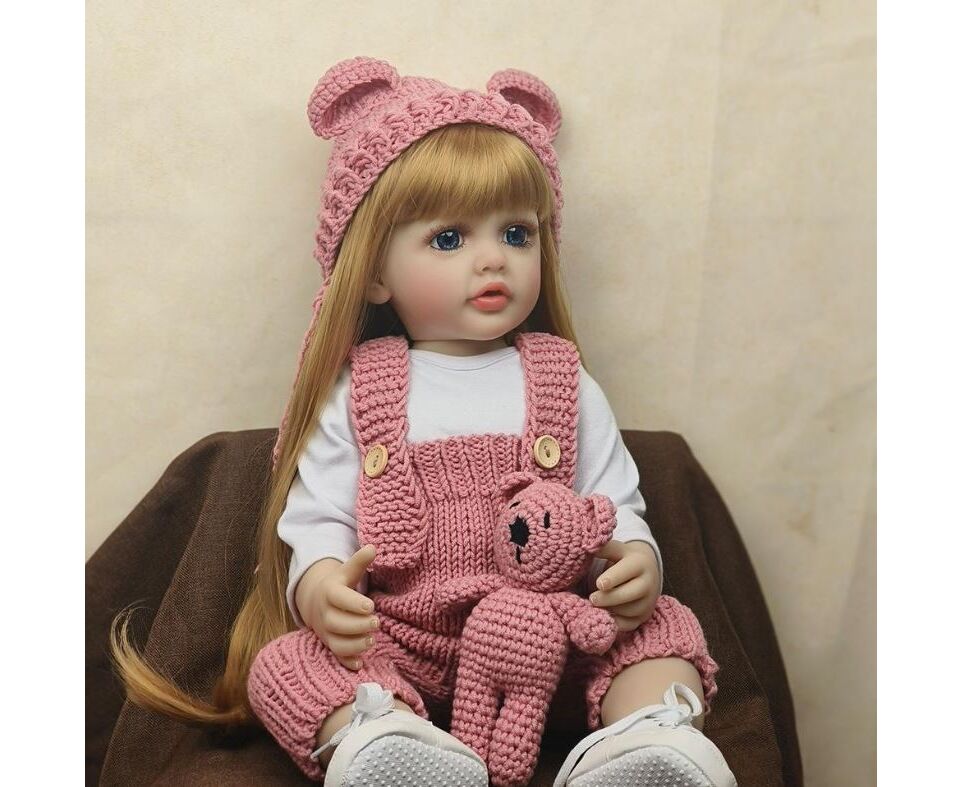 Кукла интерактивная виниловая "Кира с игрушкой в вязанном белом костюмчике", 55 см