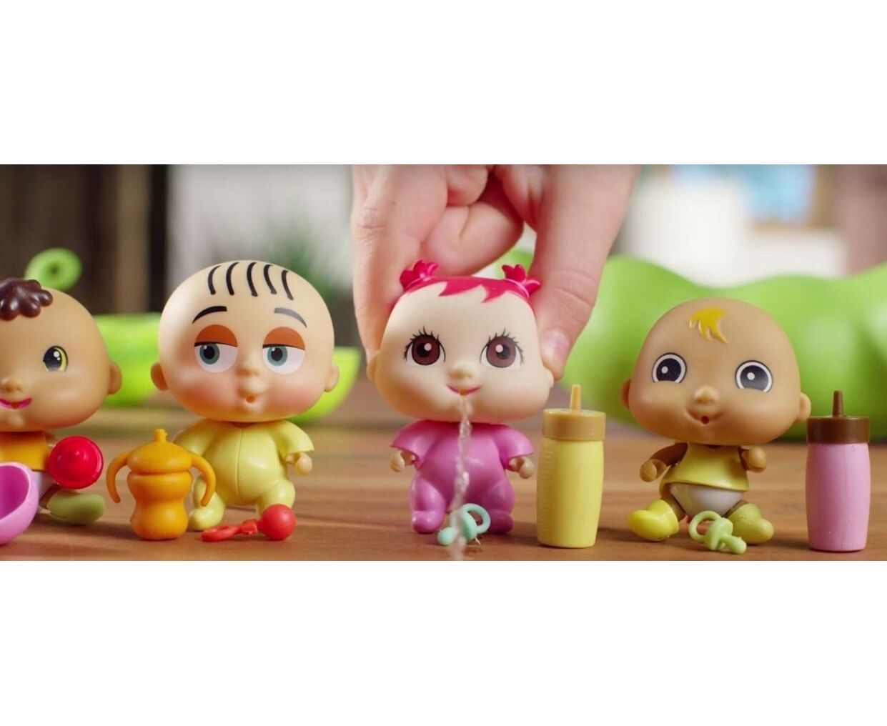 В каждом зелёном стручке скрывается 3 круглые горошинки с сюрпризами. В первой горошинке прячется маленький пупсик, во второй горошинке находится его одежда, пустышка и бутылочка, а в третьей – игрушки малыша и аксессуары. Это настоящий сюрприз: заранее не знаешь, что ждёт внутри! Собрав коллекцию из нескольких пупсиков Крошки-Горошки, можно менять их одежду, аксессуары и игрушки. Всего в серии 24 разных пупсика. Среди малышей Крошки-Горошки есть девочки и мальчики, у каждого есть своё имя. Ручки и ножки пупсиков двигаются. Если напоить пупсика водичкой из бутылочки, он начинает брызгаться.