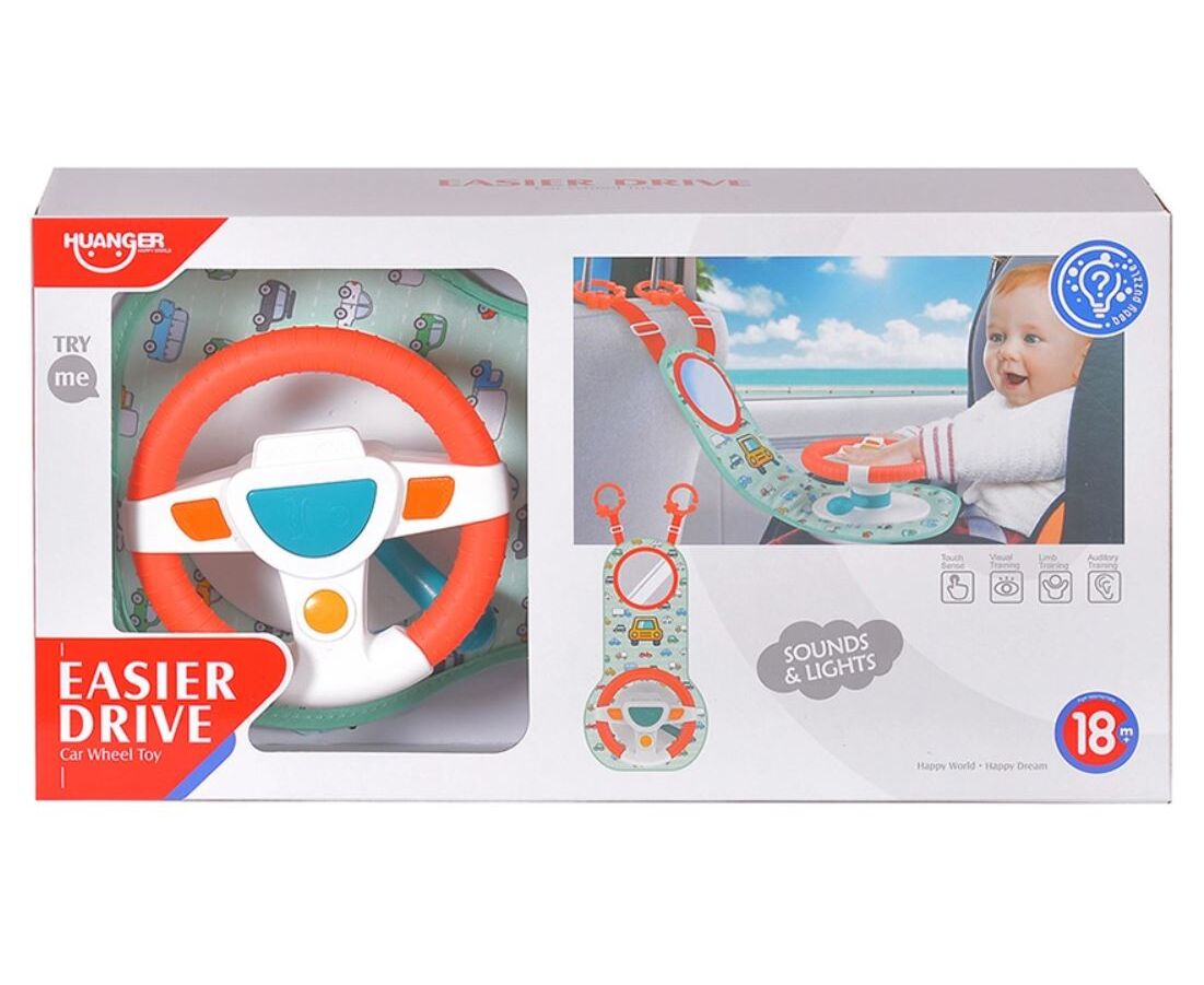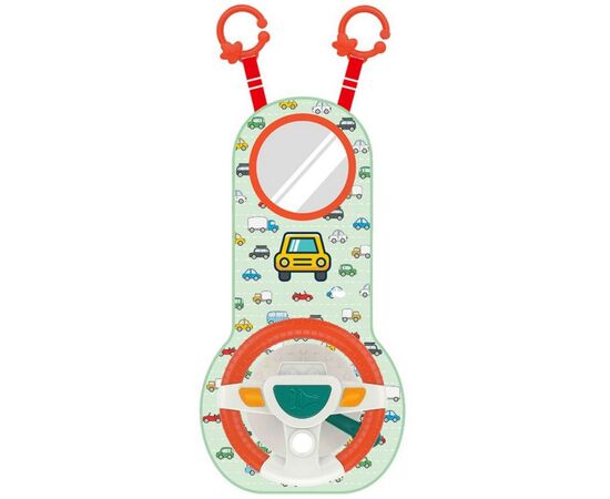 Это веселый и познавательный способ занять малыша во время поездки в автомобиле. Развивающий центр содержит: крутящийся руль с кнопками, развивающие мелкую и крупную моторику (поворотники, звуковой сигнал, кнопка зажигания со звуком мотора, а также несколько весёлых мелодий); большое безопасное зеркало; рычаг переключения передач (оснащен трещоткой). Ролевая игра помогает развить воображение малыша. Игровой центр легко крепится к подголовнику переднего сиденья. Соединительные ремни дают возможность регулировки по высоте. Размер коврика: длина 40 см, ширина верх-14 и низ-20 см.