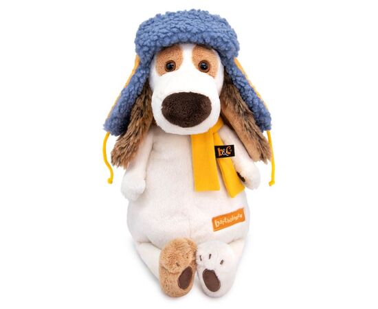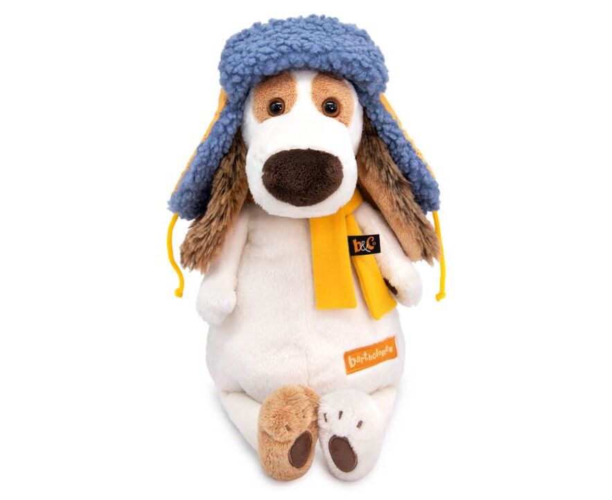 Мягкая игрушка "Собака Бартоломей в стеганой шапке и шарфе"