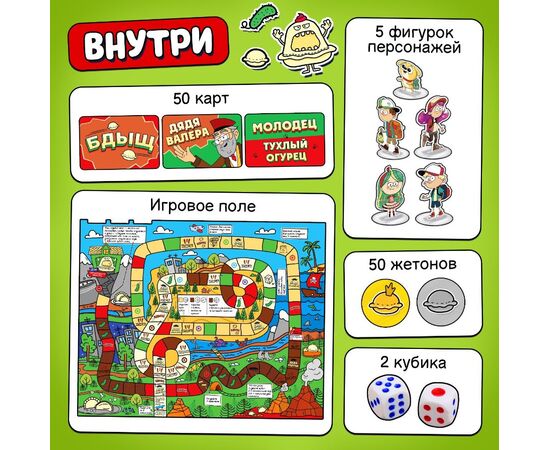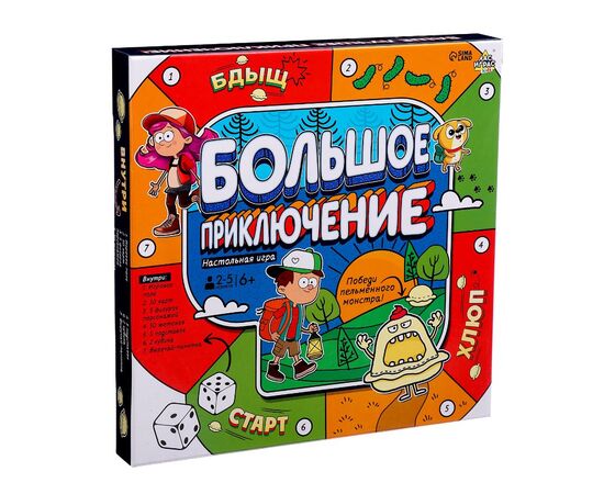 «Большое приключение» — настольная игра для детей от 6 лет. С весёлой бродилкой малыш окунётся в увлекательное путешествие. Волшебный мир снова в опасности! Ужасный монстр с армией грозных пельменей напал на жителей сказочного города. Отважные друзья спешат сразиться с врагом и остановить его злодеяния. Ребятам понадобится помощь маленьких и храбрых игроков. Вперёд навстречу захватывающим приключениям!