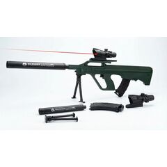 Пневматический автомат, с глушителем и лазерным прицелом, с подставкой, зеленый камуфляж в пакете