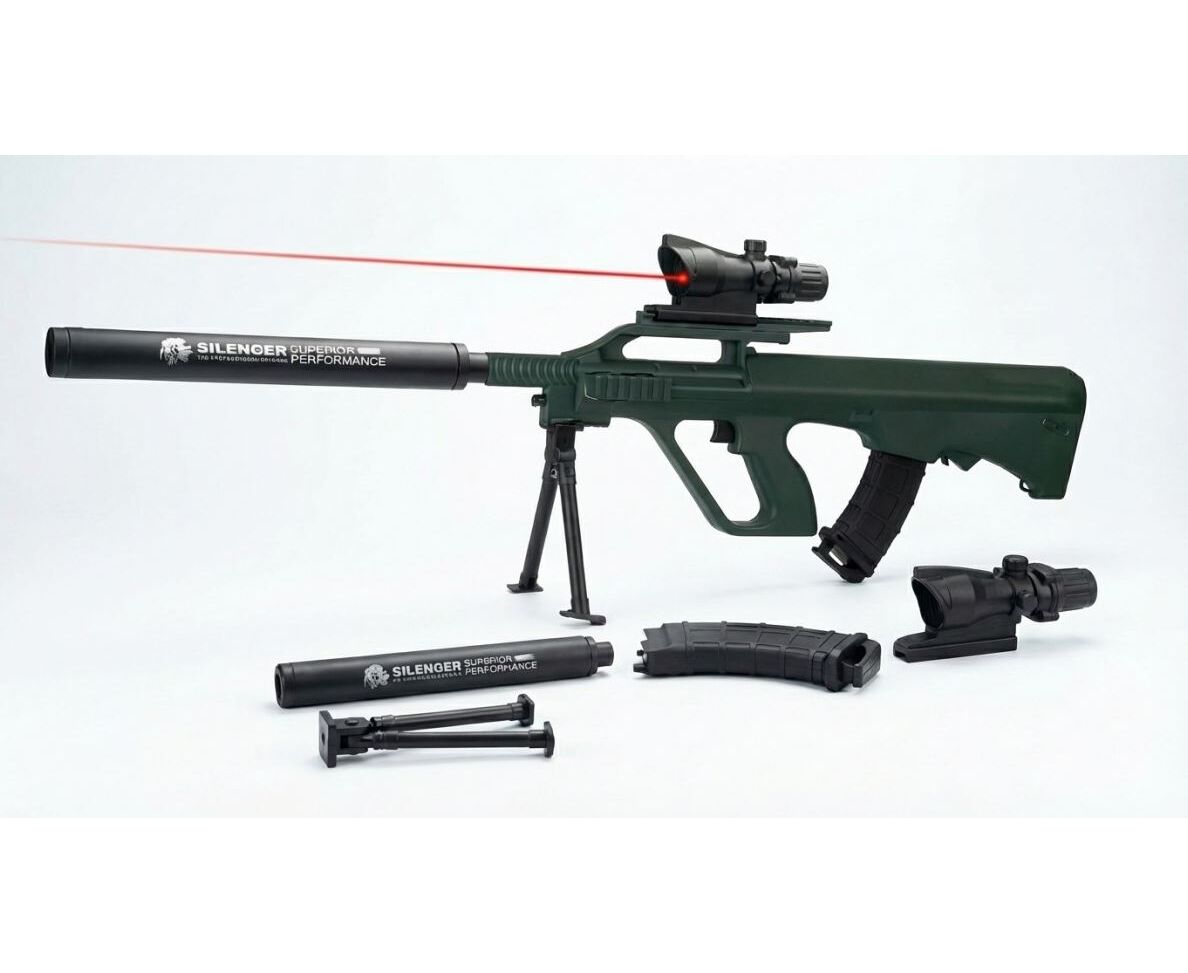 Пневматический автомат, с глушителем и лазерным прицелом, с подставкой, зеленый камуфляж в пакете