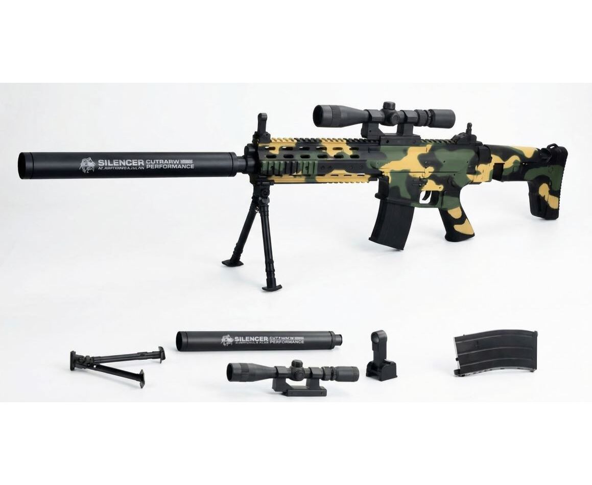 Пневматический автомат с глушителем и лазерным прицелом зеленый камуфляж в пакете