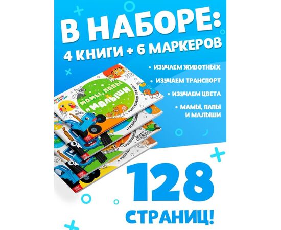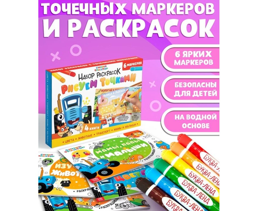 Подарочный набор раскрасок "Рисуем точками", 6 точка - маркеров, 4 шт. по 128 стр., Синий трактор