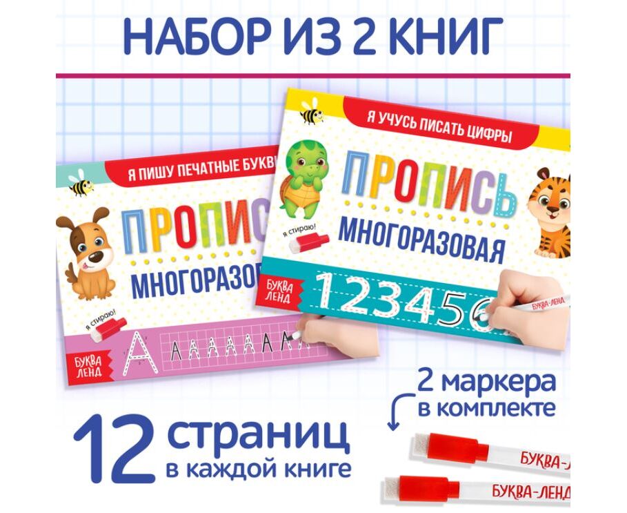 Прописи многоразовые "Напиши и сотри. Пишем буквы и цифры", 2 книги по 12 страниц