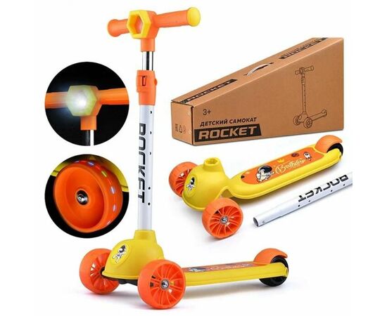 Самокат 3-х колесный ROCKET, белый с желтым, с фонариком
