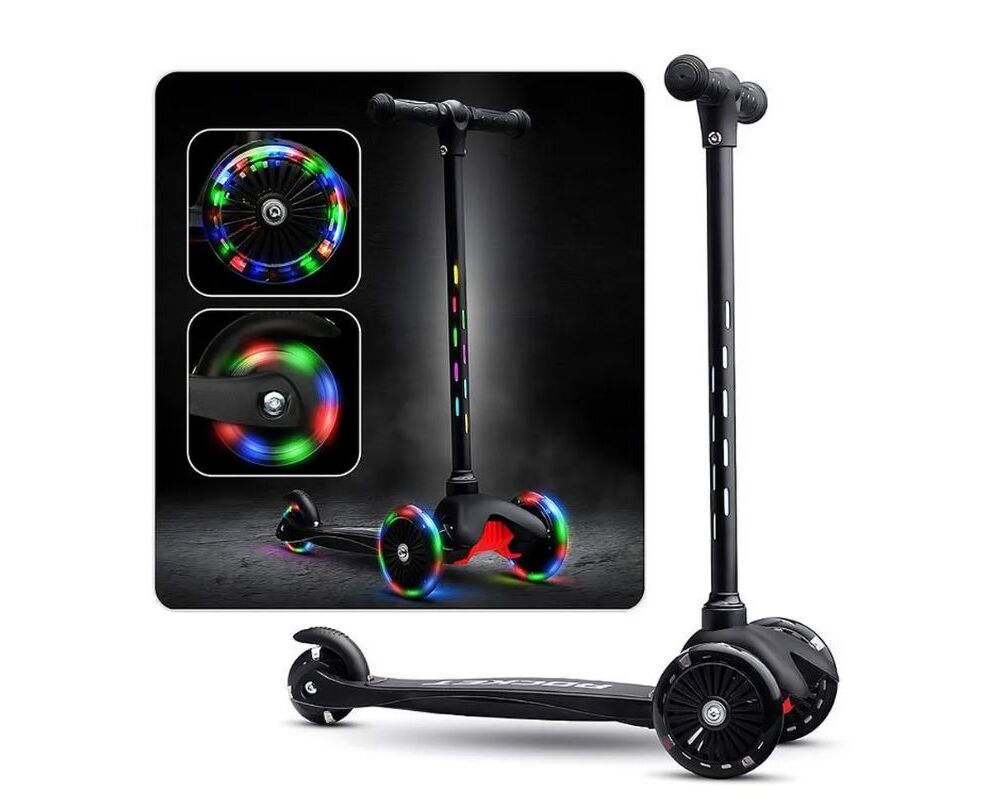 Самокат трехколесный ROCKET, колеса полиуретан, светятся колеса и стойка, цвет черный